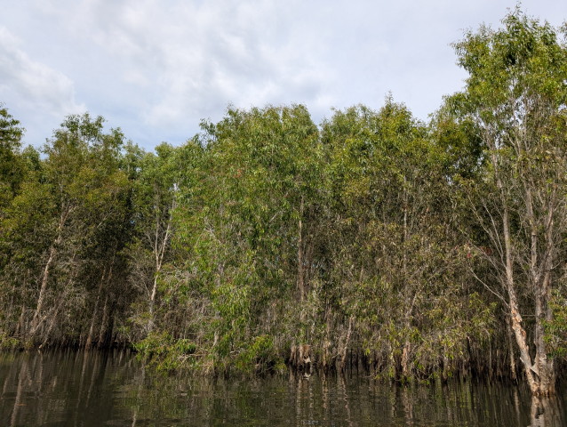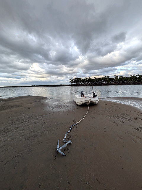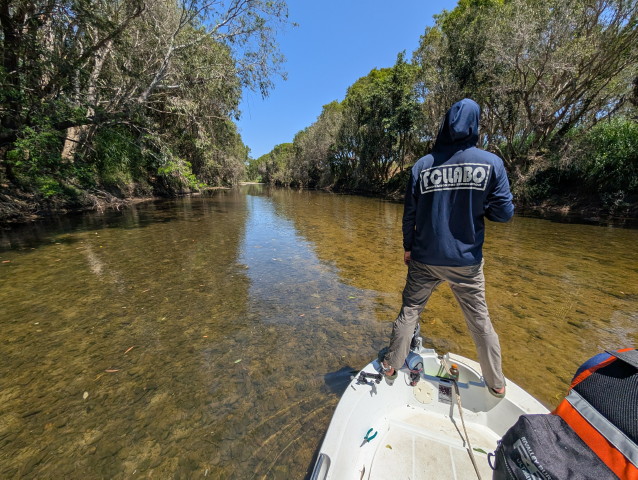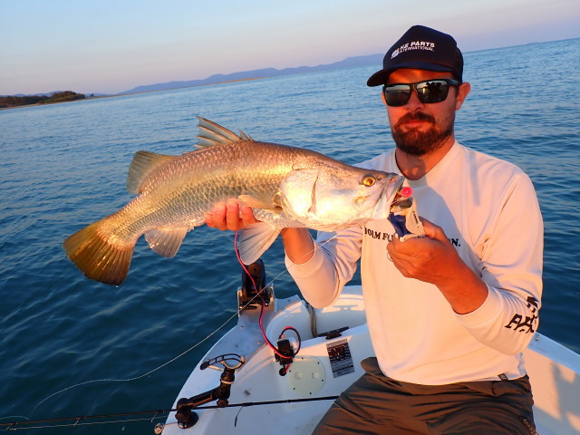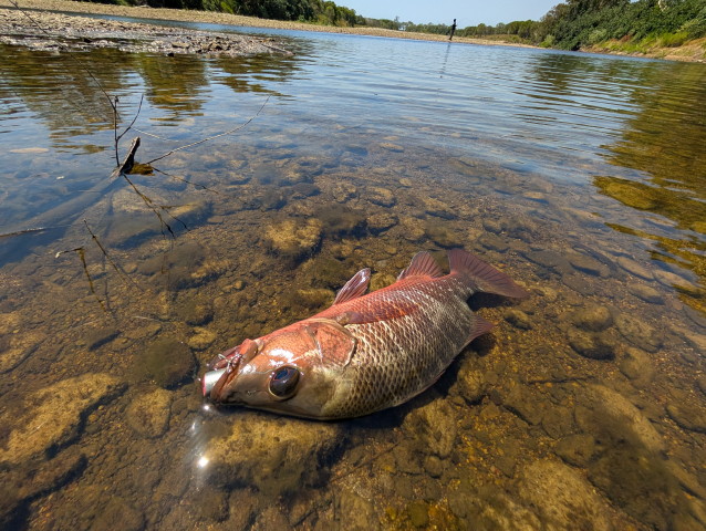 またもや例のボート結構使いであるよねこのボート、でプロサパインから南に20キロほど下って無理くりボート降ろしたwでやっぱり最初はオカッパリからw兎にも角にもこの人たち釣りが過ぎるんだよ良く生きてるねって感心するよ全く、サンドバーに船とめて歩いて水の残っている川へ対象魚はマングローブジャック、ターポン、バラマンディだ。まあ病み上がりもあって適当に釣ってみているが強欲な前のふたりの観察が面白い。特にクリスの負けず嫌いは病的だw 彼はエレキの操船してるわけなんだけれど必ず万全な状態でニュースポット入りするお堅い釣りを展開する。それに食い下がる肉食系舳先フェチのマッキーが更にくっついてくる。コイツら二人興奮すると釣られそうになるのでエンジンの上に避難して後ろから釣ってる。というかこの釣りにおけるメリットは勿論ファーストコンタクトにもあるのだが、二人が並んで釣ると基本同じ角度でスポットを打ち合う関係上 一定の難易度と方向性により固定されるつまり同じ木の下の釣りであってもキャスト角度やトレースコースが違ってくる 後ろからゆっくり気味に引っ張れる後部からのキャストはブッシュキャストに於いては ルアーの深さやスピードにおいて相違が出やすく釣れやすい場合も多いその為釣れた数順位そのものはあまり変化はない。ブッシュ奥に入れるラインもさることながら待ちの釣りができると言う有利な点もあるからだ。前のガツガツした犬みたいな二人はさておき自分が打てる角度になったら釣る釣りはある意味余裕の魚釣りである。小型のバラマンディがスクールしている箇所をいくつか見つけてだいぶ釣れた。大体居そうなとこは倒木特に流れに直角に近い状態で倒れてる木はいける、あと割に大きい枝より細かい小さい方が好きな感じバラマンディもアカメもそうだが基本大きいのを除いてストラクチャーにデッドに打つ方が数は出やすい。やがて川がいよいよ浅くなり再び徒歩へマングローブジャックはたくさんいる。これ以上は藪漕ぎの必要がある足が草履なのでこの辺りが限界みたいである。帰りもしつこく打って帰ったのは間違いない。