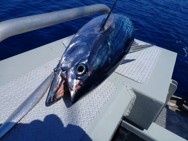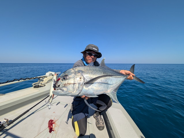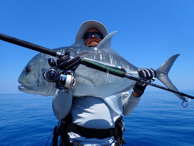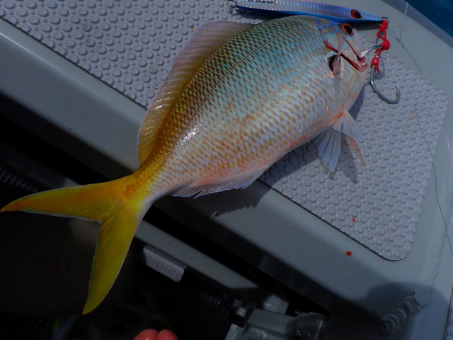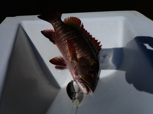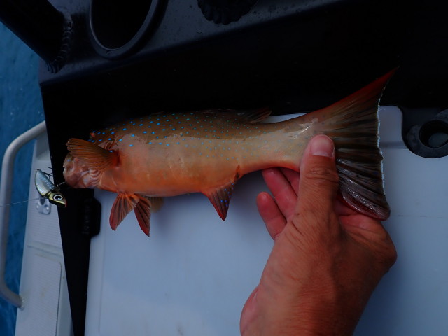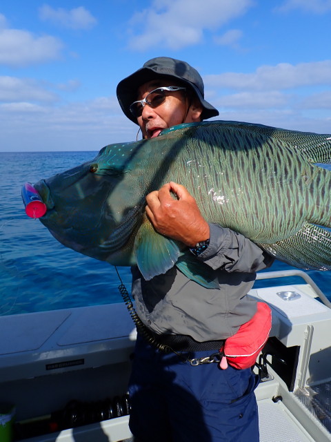 まあ GT抑えとこうかみたいな釣りである。きほん日本のGTゲームボート一匹あたりのコスト高すぎだ。まあしょうがないけど、吹っ飛ぶような時速75キロぐらいで1時間ちょいで到着全てが飛びそうな勢いでエリア到着したが実際幾つか飛んでったような気がする。 CCショート40ミリ2投目でラス(ナポレオン)が釣れた。テーパー35−70試しに8号セットで5、5mフルラインで投げてみている。魚が魚だけに一発でザラザラだで調子に乗って新品に変えて水深3m位とこで投げてたらルアー一瞬で取られたw浅すぎてリーダーじゃなくてPEから逝ってしまった。ロングキャストもよ〜く考えようねって感じだ前側で投げさせていただいている、珍しくw ラインシステム組んでたらヤッパリ後ろになってたけどw