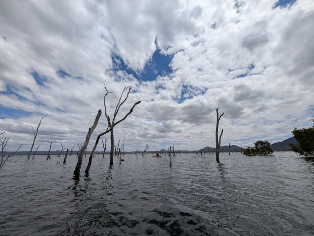 朝6時ダムスロープ集合で釣り開始するまあなんと言うかダムの状況は最悪 このダムに通って12年余りが経過しているが 初めて訪れて以来の水量だった。多分夜間の釣り以外で数を出すのが難しいと感じる水位だったから。何故なら水位が高いと牧場内部の生木まで水没してしまい通常浅いラインが大好きであるコイツらの棲家が一気に拡散してしまうので浅場ウィードのサイト(視覚に頼った)に頼った釣りを展開するにあたって場所の絞り込みの時点で 優先できる場所を見失っているからだ。そうなるとヒット&アウェイ形式のモーターボートによる釣りの方が俄然有利となる。タプタプの水面に2馬力エンジンのカヌーを走らせる、昨日ボートもらった序でにダムを見た時予感がしたのでクリス氏と一緒にマッキーを行かせて見る。彼の場合は釣果第一のレベルな訳で魚の顔くらい見せておく必要があると感じたからでボツボツながら釣ってるみたいである。朝スロープをでて真ん中通って北側の立木帯へと舟を走らせてみる。なんと言うか釣れる気しねーWこれたぶん魚探が要るなと思った。先の説明のように生木が奥深くまで水没していて 全く釣れる気がしない。それに9月の後半は基本日本でいうところの3月後半な訳で亜熱帯とはいえ肌寒い感じだ。魚は多分船の来ない浅いところにいるとして立木があまりなくてショアラインにあんまり突っ込むところが無いキャンプ場前あたりに移動した。そこで新型の超浅場用ハイフロートミノーを2回小さいカエルが乗れそうな水草の際に投げたら水面炸裂やっぱ居た!!が、ランディングギヤ忘れたなーと思って適当にファイトしてたら外れたw結局これ以降魚を見つけることも水面に出すことも出来ずに終了した、、、。いいサイズだったのに。