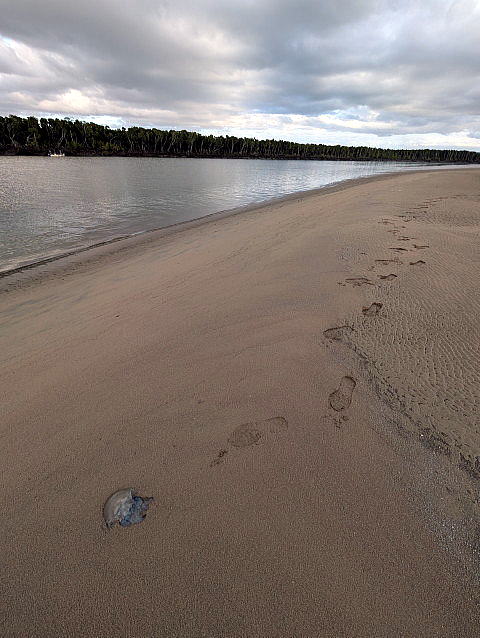 でもやってるとマッキーの視線を感じるのでつまらんくなってサンドバーの探検に切り替えた。メインリバーの反対側の岸辺に向けて朝既に上陸していた、現地のオジサンの足跡を追いかけてみる。マングローブに続いては居るが途中に5m程の支流が流れている。当然そこを渡るつもりはないがw ルアーは数投してそこに沿って下に行くとターポンらしきものが掛かって外れた。基本この辺りで水辺に立つのはNGである。危険動物ではあるが、節度はある。鈴鳴らして逆に寄ってきたりとかそんな仕様変更は基本無い。