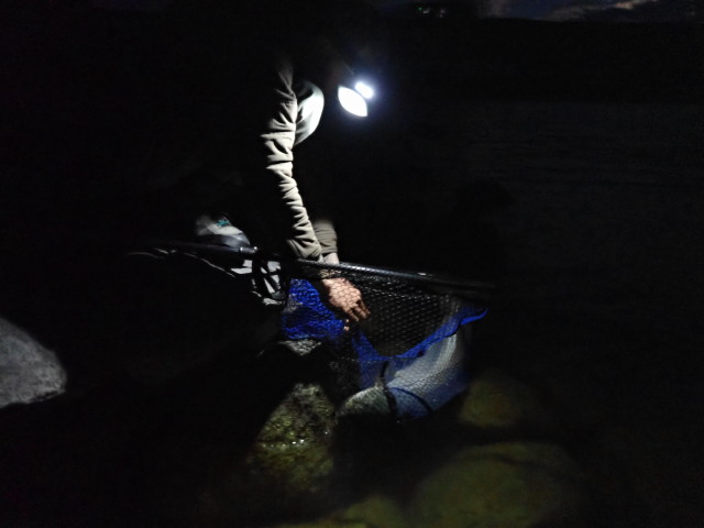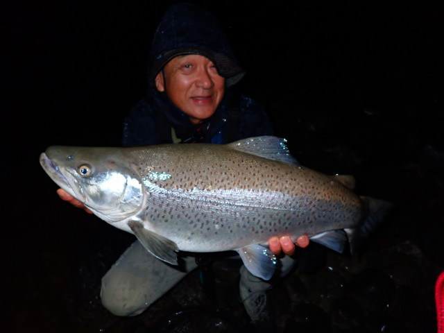夜間ウロウロするようになってここには2パターンの人の流れがある事が判明、エッグロール族 昼間と夜間のワーム族である。ジグヘッドにワーム結構多い。私の場合ここでフライという選択肢無い人なのでとりまルアーテーマで釣り展開で行くつもりなのだが基本初見殺し的釣りで行くならオモリつけてミノキャロはある程度効果があることがわかっている。ただ連続は気候的天候的問題水量の問題があるので日ムラがあると考えておく。夜間は比較的簡単にヒットが取れるだが現場の底の状況を把握しておかないと 藻カキで終わってしまうので注意が必要だ、とにかくハリ数が多いルアーの場合 ディディモや金魚草モドキを釣らないように釣りを展開する必要がある。トカラで会った現地ニュージーランド人の彼らに聞いたらブラウンだけではなく夜間は全てのマスが釣れるらしい。まあとりわけブラウンはアグレッシブだけどイワナ族とサーモンは相違があるのか?と考えている。釣る場所の問題もありそうだが、藻が問題なのだ。アレから2回夜勤に行ったが、兎にも角にもブラウンしか釣りきれないのが問題だw大分釣れるのだが、北海道や秋田あたりでも夜釣るなら色んなのが釣れるかもしれんなーと思ったが、先ず件の猛獣の対策が解決しないと夜間なんか自殺に行くようなものだ。そういえばサーモンの養殖も盛んで その脇で釣りする釣り人も多い。勿論サーモンも釣れるし美味しいらしい ボトムは金魚藻のような形態の藻が生えているので基本ソフトベイトで釣るようだ。攻略するのであれば別の何かが必要な気がする。そういう意味ではシングルフックで釣るエッグなどはその対策がなされて効率的なのかも知れない。朝、家の前になんか車止まってたと思ったらトカラで会った二人組w天候大荒れなんで来ないだろうと思ってたけど来たんだ、、、、、w いやまじ喋り出すと止まらない彼にダンカン氏もタジタジだw俺は紳士的に対応する彼に軽く押し付けてじぶんの渓流の準備してたけど、やっぱ連行されたw ダンカン明らかに悪い顔して押し付けて来たw