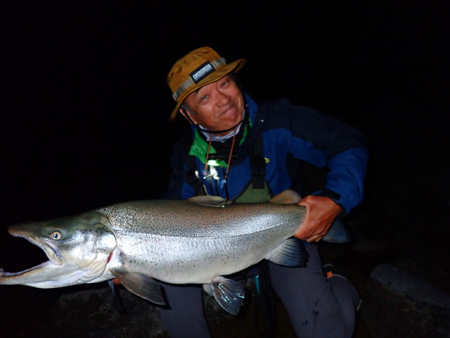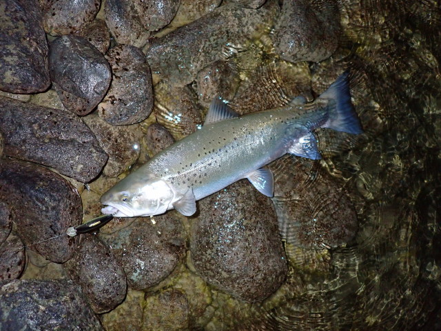 今日もマジックカーペットかと思いきや 今日は昨日バラしたとこに来た、ネストに居るでかいマスをガイドがダンカン氏リモートで釣ってた。自分は本日は適当に過ごすことにしている何故なら夜行こうと思っているからだ、こんなに昼釣れないなら夜行ってみようかとちょっと考えている。だから思うように勝手に歩いて投げて見ていた。基本的に恐らくだが自分のやり方ではレインボーはあんまり反応しない可能性をかんがえていた。ダンカン氏は遂に10キロオーバー釣っていた。おめでとう飯奢るよお祝いにって感じである。早めにガイドに別れを言い夜に備えた 生憎の雨時間は8時ぐらいだったとおもう、幾つかあるキャナルの吐き出し口の中であまり藻の生えていない岩の多い場所を選ぶ。トワイゼルから20っ分でいける場所だ、雨なので誰もいない HKTM