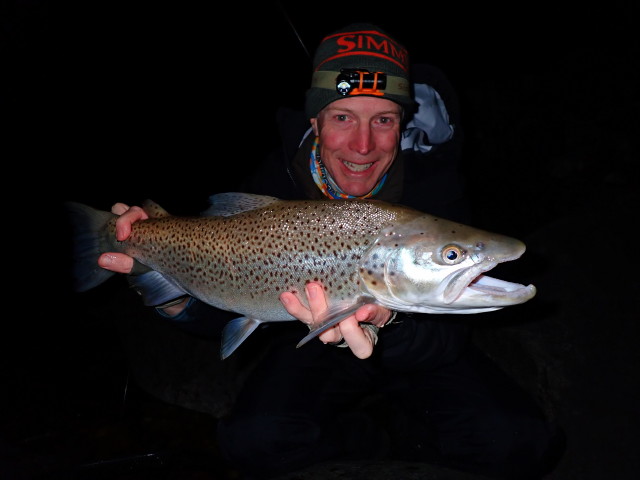 昨日釣れた地点からスタートしたが本日昨日の雨なのか水が10センチ程度高い、てか流れ強い。川底をゆっくり歩きつつ下流へ ダンカン氏は昨日オカッパリ魚見れんかったせいか結構前向きだ。早速支流を本流に向かって歩いている背丈が20センチ以上違う私にはできそうも無いので昨日のコースで最後にやめた支流まで歩く。いや確実に昨日より流れがある。無難に渡って昨日釣れた岸側のエグレを釣って行く昨日釣れた地点から5m程下流の対岸直ぐでヒットまたもやアングリーブラウンである。 小さな支流を一気に50m程ジャンプしながらポイントぶっ潰したあとやっと上がった。あーあ」。気を取り直して本流との合流点 本流まで10m位のチャラ瀬でまたもやヒットこいつはヒットエリアが本流から入ってすぐなので やばかった取り敢えずスプールサミングしながら本流に行かないように操作して何とかなった。でも釣れたのはヤッパリブラウンなのだ。・・・w俺は呪われている。 以降いい場所はあったが昨日ダンカン氏が言っていた場所のようなので釣れなかった。そう言えばこの国で溜まりで釣れていないな。この場所に至っては瀬でしか釣れていない。ぼちぼち浅瀬を探して車側の川岸沿いを歩くともう一本拾えたそこで終了。次の中州に入れればおそらくまた釣れるともうが本日はおめでとう10キロオーバーの日なので夕方pubへ食い切れない大きさの肉を唸りながら食った。腹ごなしに夜勤に行ってみたが本日は違う場所 養殖筏前に行ってみる。明るいので大して釣れる気がしなかったがヤッパリそうだったw