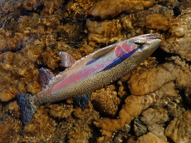 まあ適当にそのあたりでキャストしてみたけど何かがかかる感じではなかった。出だしが悪かったせいとこれが3日も続くのかという思いから先行き暗い感じだなと自分は思った。その日も傾きかけたころ自分にもニジマスヒットした。錘をルアーから1、3m程度離して投げて見たゴム張りの鮎鉛よく淵とかで使うやり方だがゾーニングがうまくいかない関係でそうなっている可能性があるのでやって見たら3回目のアタリでフックできた。大きくはなかったが満足はしたし何かが見える可能性も垣間見た気がした。ただ依然として普通にひっぱってもつれないのか?という疑問も湧いた。