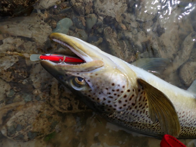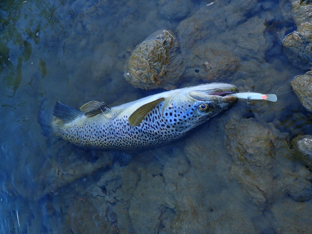 ジンジャービアーと一緒にステーキパイ(ゴロゴロ肉入り)食べて再度川に入る。まあ今までが今までなので、底に蔓延っている「ディディモ」と呼ばれる腐った様な藻 日本も解禁直後の流れの緩い場所に生えてる アレの強化版みたいなのが ボトムでほぼ99%針に引っ掛かってくるので浅いやつに変えて投げている。開始5分メインラインから手前側に分岐した支流を幅20mぐらいの対岸近くを引き出してすぐ!!ヒットした どこに居た?と思えたがまあ魚だ、またもや例の雷魚の首振りと思いきや 猛烈に下流に向かってジャンプしつつ走り出す。タックルは71Tに10LBリーダー1、75号ミノーは7センチの3フック 昔々の映画のように50mぐらい凸凹のヤチ坊主みたいなボサを飛び越えつつフォローしてやっと取れた 、マジ舐めとったこんな引くのいるんや、てか何で?何が彼をそうさせたのか?まあ、タスマニアの時もそうだったが、シーランは引くと言われ気味なのは間違いない。その前に靴はちょっとだけ濡れてはいたが完全に膝上までびっちゃり濡れたのでもう守るものも無くなりとっとと川の中を歩きつつさっき魚が出て来たエリアの状況を加味しつつ あちこちキャスティングしてみる、一匹いたら多分もっといるかも?と思うのは 釣りの常である。そこから下流でさらに2つに分かれていたので、靴が濡れていないダンカン氏は岸際を自分は中州へ渡ってさらに小さな分岐を下った。次のストライクは直ぐだった、魚が隠れそうな水流の両脇のドロップギリギリからダウンクロスで流していたら、ヒットした。勿論前アタリもあったので確信のあるストライクだった。ところがである、またやってしまった合わせギレである、反転していくブラウンのボディだけ見えた。1っ匹目のファイト中 後半ドラグ入れたの忘れてたw今釣行2回目w我ながらアホすぎ。リーダーさきからのブレイクだったのでチェックして次のプラグを結び直す正直あんまあのサイズ無いw売るほどあるのに持って来てない。79を結んで同じようにダウンクロスで少しづつ下がってゆく結果は直ぐ出た次はレインボーだった。こいつも1っ発目に比べれば大丈夫だったが同じプール内で処理できて良かった。そこからパンツまでぬれて川を渡り広い中州を横切る、中州にも例のチクチク刺さる薮が多くて初見で通行に苦労した。まあしかし蛇いない設定なので腰までの草でも普通に歩く。コレがオーストラリアやタスマニアだったら絶対行かない。ある意味この国渓流は天国だなと思う。水多くて死にそうになるけどw。やがて別の支流へでた、ちょっとだけ岸よりで別れたダンカン氏のことが心配になってきた。取り敢えずクロスストリームで手前までベッタリ流して2投目ブラウンだった、コイツは割に綺麗な感じだ色が濃ゆい。まだ釣れそうだったが 一応逸れたダンカン氏に連絡してみる戻りつつ釣りしているらしいので私も戻る事にした。明日来るならウェーダー履こうw寒すぎるww。