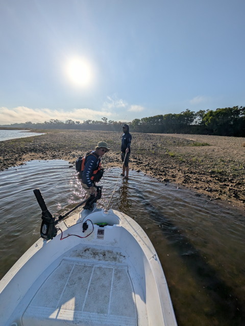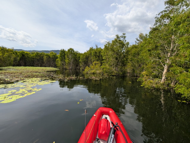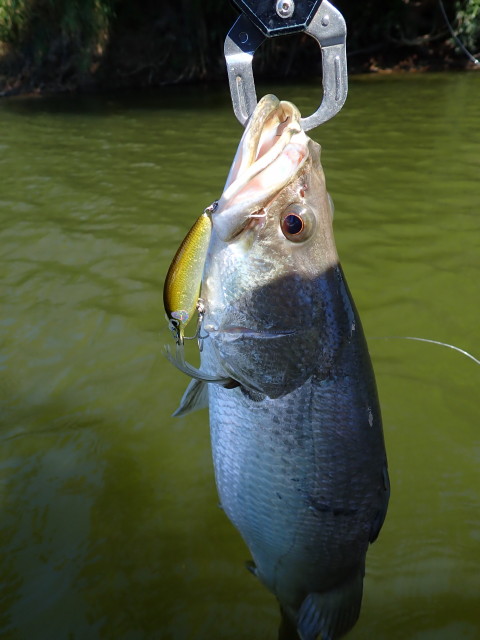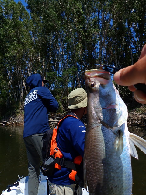 またもや例のボート結構使いであるよねこのボート、でプロサパインから南に20キロほど下って無理くりボート降ろしたwでやっぱり最初はオカッパリからw兎にも角にもこの人たち釣りが過ぎるんだよ良く生きてるねって感心するよ全く、サンドバーに船とめて歩いて水の残っている川へ対象魚はマングローブジャック、ターポン、バラマンディだ。まあ病み上がりもあって適当に釣ってみているが強欲な前のふたりの観察が面白い。特にクリスの負けず嫌いは病的だw 彼はエレキの操船してるわけなんだけれど必ず万全な状態でニュースポット入りするお堅い釣りを展開する。それに食い下がる肉食系舳先フェチのマッキーが更にくっついてくる。コイツら二人興奮すると釣られそうになるのでエンジンの上に避難して後ろから釣ってる。というかこの釣りにおけるメリットは勿論ファーストコンタクトにもあるのだが、二人が並んで釣ると基本同じ角度でスポットを打ち合う関係上 一定の難易度と方向性により固定されるつまり同じ木の下の釣りであってもキャスト角度やトレースコースが違ってくる 後ろからゆっくり気味に引っ張れる後部からのキャストはブッシュキャストに於いては ルアーの深さやスピードにおいて相違が出やすく釣れやすい場合も多いその為釣れた数順位そのものはあまり変化はない。ブッシュ奥に入れるラインもさることながら待ちの釣りができると言う有利な点もあるからだ。前のガツガツした犬みたいな二人はさておき自分が打てる角度になったら釣る釣りはある意味余裕の魚釣りである。小型のバラマンディがスクールしている箇所をいくつか見つけてだいぶ釣れた。大体居そうなとこは倒木特に流れに直角に近い状態で倒れてる木はいける、あと割に大きい枝より細かい小さい方が好きな感じバラマンディもアカメもそうだが基本大きいのを除いてストラクチャーにデッドに打つ方が数は出やすい。やがて川がいよいよ浅くなり再び徒歩へマングローブジャックはたくさんいる。これ以上は藪漕ぎの必要がある足が草履なのでこの辺りが限界みたいである。帰りもしつこく打って帰ったのは間違いない。