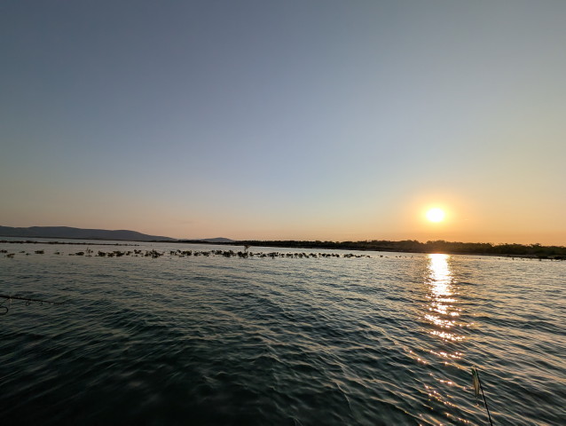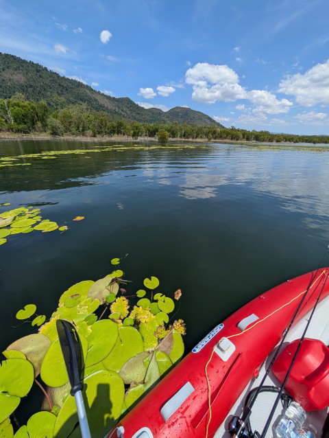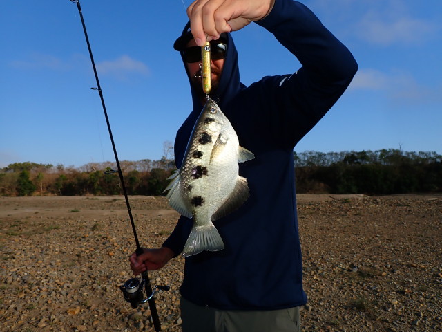 朝6時ダムスロープ集合で釣り開始するまあなんと言うかダムの状況は最悪 このダムに通って12年余りが経過しているが 初めて訪れて以来の水量だった。多分夜間の釣り以外で数を出すのが難しいと感じる水位だったから。何故なら水位が高いと牧場内部の生木まで水没してしまい通常浅いラインが大好きであるコイツらの棲家が一気に拡散してしまうので浅場ウィードのサイト(視覚に頼った)に頼った釣りを展開するにあたって場所の絞り込みの時点で 優先できる場所を見失っているからだ。そうなるとヒット&アウェイ形式のモーターボートによる釣りの方が俄然有利となる。タプタプの水面に2馬力エンジンのカヌーを走らせる、昨日ボートもらった序でにダムを見た時予感がしたのでクリス氏と一緒にマッキーを行かせて見る。彼の場合は釣果第一のレベルな訳で魚の顔くらい見せておく必要があると感じたからでボツボツながら釣ってるみたいである。朝スロープをでて真ん中通って北側の立木帯へと舟を走らせてみる。なんと言うか釣れる気しねーWこれたぶん魚探が要るなと思った。先の説明のように生木が奥深くまで水没していて 全く釣れる気がしない。それに9月の後半は基本日本でいうところの3月後半な訳で亜熱帯とはいえ肌寒い感じだ。魚は多分船の来ない浅いところにいるとして立木があまりなくてショアラインにあんまり突っ込むところが無いキャンプ場前あたりに移動した。そこで新型の超浅場用ハイフロートミノーを2回小さいカエルが乗れそうな水草の際に投げたら水面炸裂やっぱ居た!!が、ランディングギヤ忘れたなーと思って適当にファイトしてたら外れたw結局これ以降魚を見つけることも水面に出すことも出来ずに終了した、、、。いいサイズだったのに。