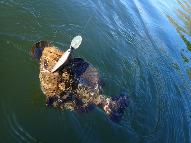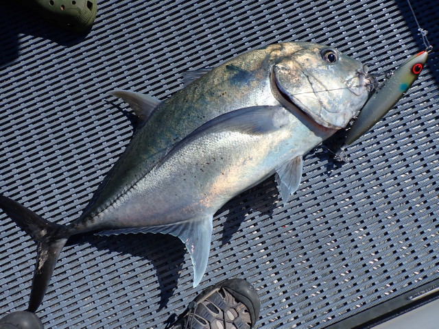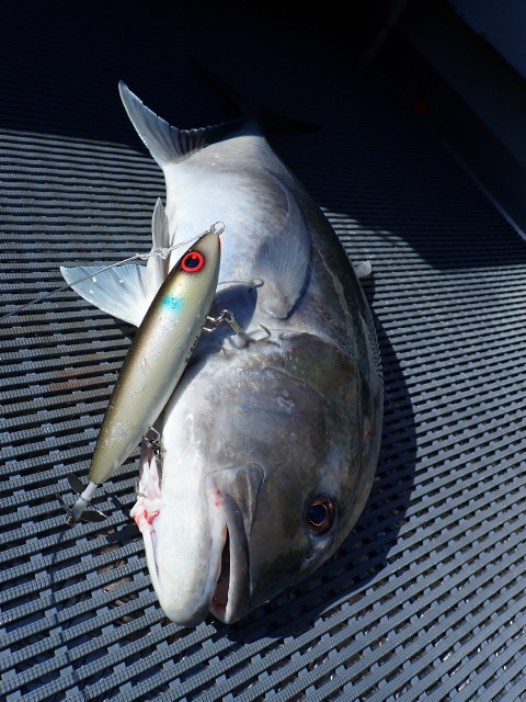 まあ GT抑えとこうかみたいな釣りである。きほん日本のGTゲームボート一匹あたりのコスト高すぎだ。まあしょうがないけど、吹っ飛ぶような時速75キロぐらいで1時間ちょいで到着全てが飛びそうな勢いでエリア到着したが実際幾つか飛んでったような気がする。 CCショート40ミリ2投目でラス(ナポレオン)が釣れた。テーパー35−70試しに8号セットで5、5mフルラインで投げてみている。魚が魚だけに一発でザラザラだで調子に乗って新品に変えて水深3m位とこで投げてたらルアー一瞬で取られたw浅すぎてリーダーじゃなくてPEから逝ってしまった。ロングキャストもよ〜く考えようねって感じだ前側で投げさせていただいている、珍しくw ラインシステム組んでたらヤッパリ後ろになってたけどw