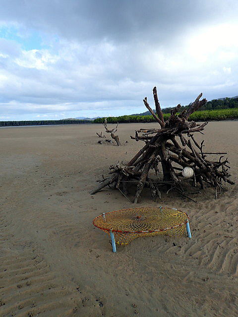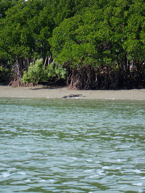 でもやってるとマッキーの視線を感じるのでつまらんくなってサンドバーの探検に切り替えた。メインリバーの反対側の岸辺に向けて朝既に上陸していた、現地のオジサンの足跡を追いかけてみる。マングローブに続いては居るが途中に5m程の支流が流れている。当然そこを渡るつもりはないがw ルアーは数投してそこに沿って下に行くとターポンらしきものが掛かって外れた。基本この辺りで水辺に立つのはNGである。危険動物ではあるが、節度はある。鈴鳴らして逆に寄ってきたりとかそんな仕様変更は基本無い。