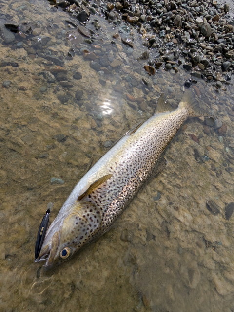 昨日釣れた地点からスタートしたが本日昨日の雨なのか水が10センチ程度高い、てか流れ強い。川底をゆっくり歩きつつ下流へ ダンカン氏は昨日オカッパリ魚見れんかったせいか結構前向きだ。早速支流を本流に向かって歩いている背丈が20センチ以上違う私にはできそうも無いので昨日のコースで最後にやめた支流まで歩く。いや確実に昨日より流れがある。無難に渡って昨日釣れた岸側のエグレを釣って行く昨日釣れた地点から5m程下流の対岸直ぐでヒットまたもやアングリーブラウンである。 小さな支流を一気に50m程ジャンプしながらポイントぶっ潰したあとやっと上がった。あーあ」。気を取り直して本流との合流点 本流まで10m位のチャラ瀬でまたもやヒットこいつはヒットエリアが本流から入ってすぐなので やばかった取り敢えずスプールサミングしながら本流に行かないように操作して何とかなった。でも釣れたのはヤッパリブラウンなのだ。・・・w俺は呪われている。 以降いい場所はあったが昨日ダンカン氏が言っていた場所のようなので釣れなかった。そう言えばこの国で溜まりで釣れていないな。この場所に至っては瀬でしか釣れていない。ぼちぼち浅瀬を探して車側の川岸沿いを歩くともう一本拾えたそこで終了。次の中州に入れればおそらくまた釣れるともうが本日はおめでとう10キロオーバーの日なので夕方pubへ食い切れない大きさの肉を唸りながら食った。腹ごなしに夜勤に行ってみたが本日は違う場所 養殖筏前に行ってみる。明るいので大して釣れる気がしなかったがヤッパリそうだったw